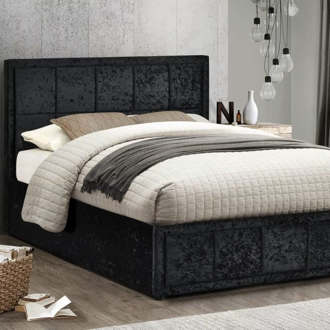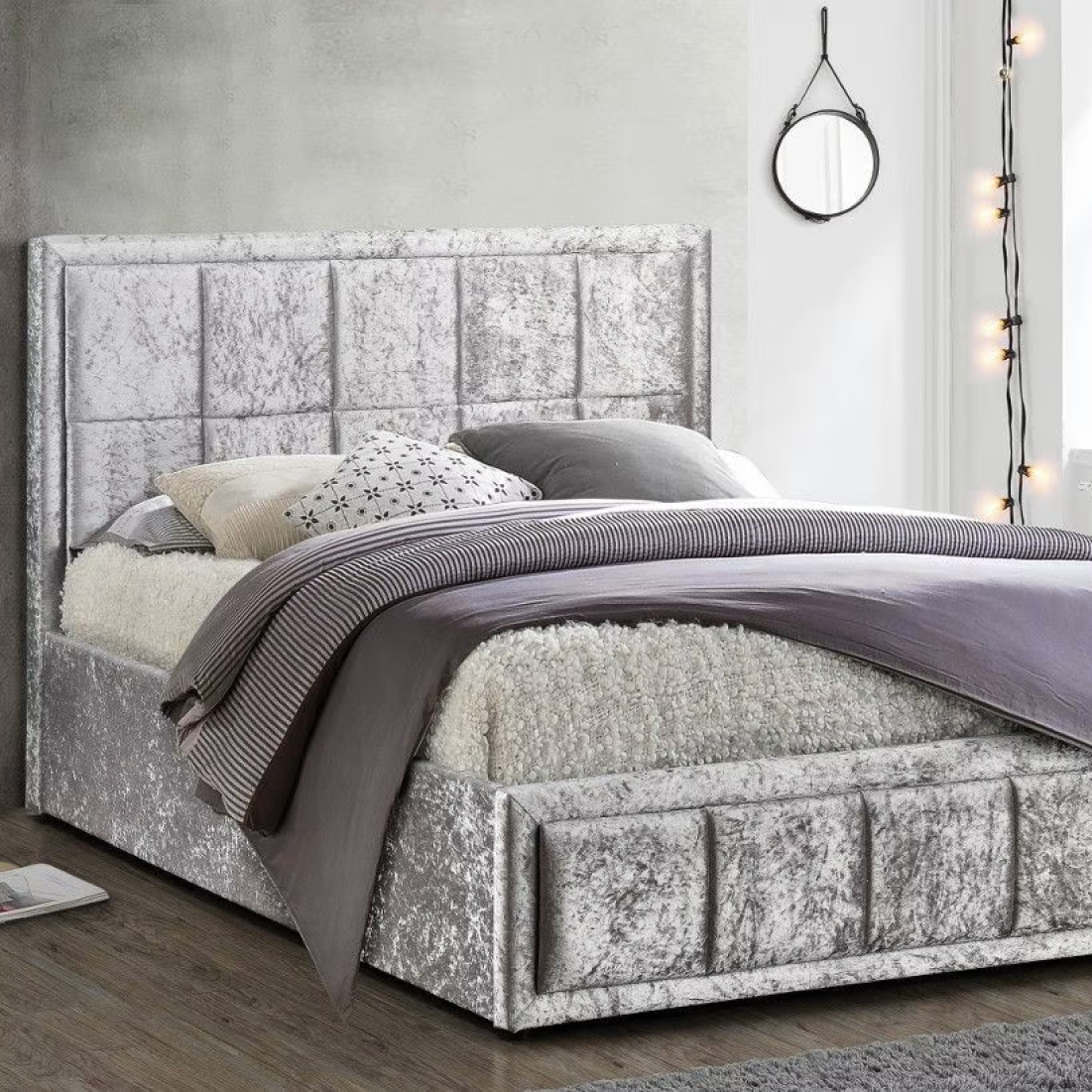 The Hannover Fabric Ottoman bed is a stylish and comfortable space-saving solution with extra storage. It features a sprung slatted base, comes in steel or velvet fabric, and has a gas piston strength of 600 N. It can support up to 45 kg of weight and includes a protective base sheet.