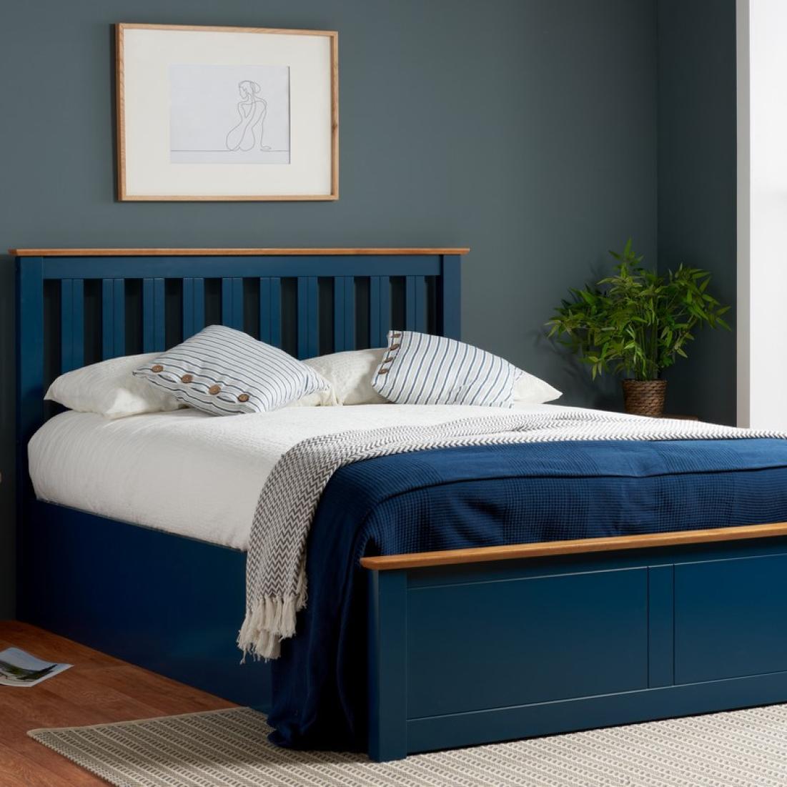 The bed's base is available in a solid finish and comes in a selection of five stylish colors: white, pearl grey, oak, stone grey, and navy blue. Choose the one that best fits your decor and taste.
