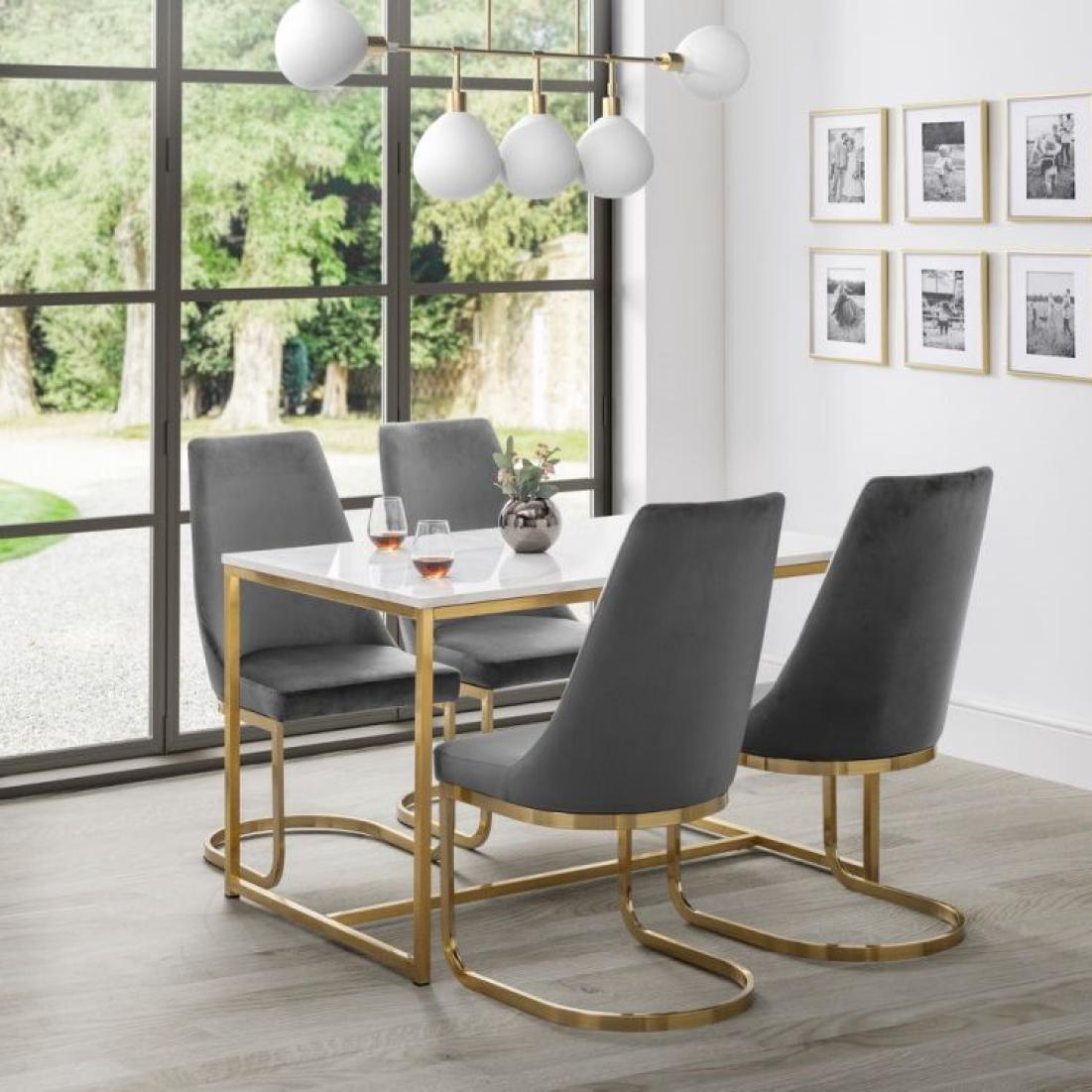 Scala is a sleek dining table with chic marble effect top on a well-crafted gold-plated stainless steel frame. It has a timeless Italian design that fits well with a wide range of decorative styles.
