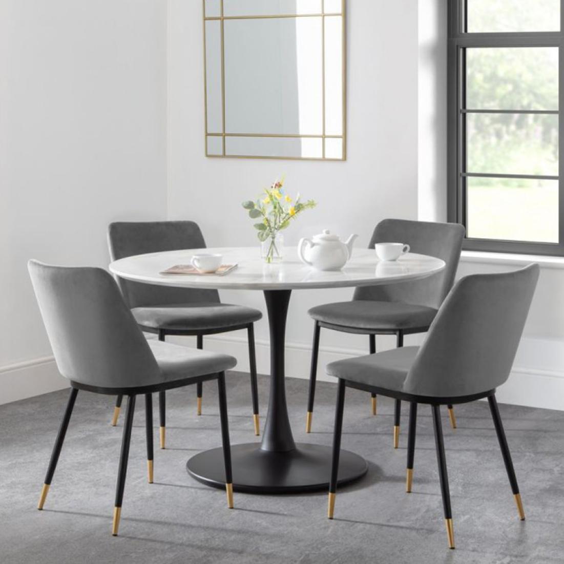 For those looking to elevate their smaller dining space, The Holland is a stunning choice. Its trendy monochrome palette and striking marble finish exude sophistication, making it a glamorous addition to any room. Complete the look with four stylish Dealuanay Chairs.