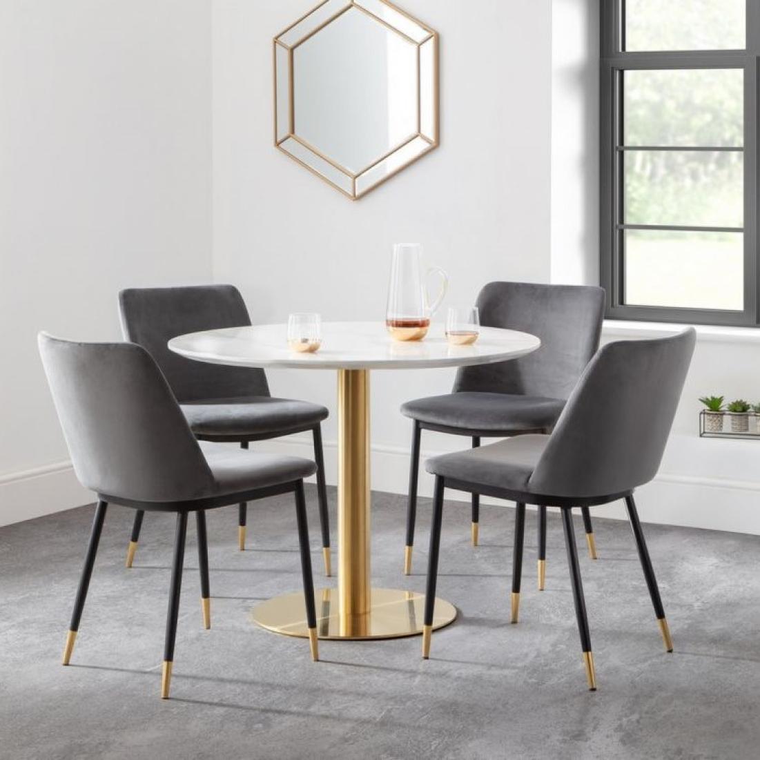 Upgrade your dining area with the Palermo round pedestal table - a stunning piece that blends modern aesthetics with classic functionality. Its sleek design features a smooth marble top that's effortless to clean, and a sturdy gold base that exudes sophistication. This table is perfect for intimate gatherings with friends or family, providing a beautiful setting for drinks or a casual lunch. Make a statement with the Palermo in your home, and elevate your dining experience to the next level.