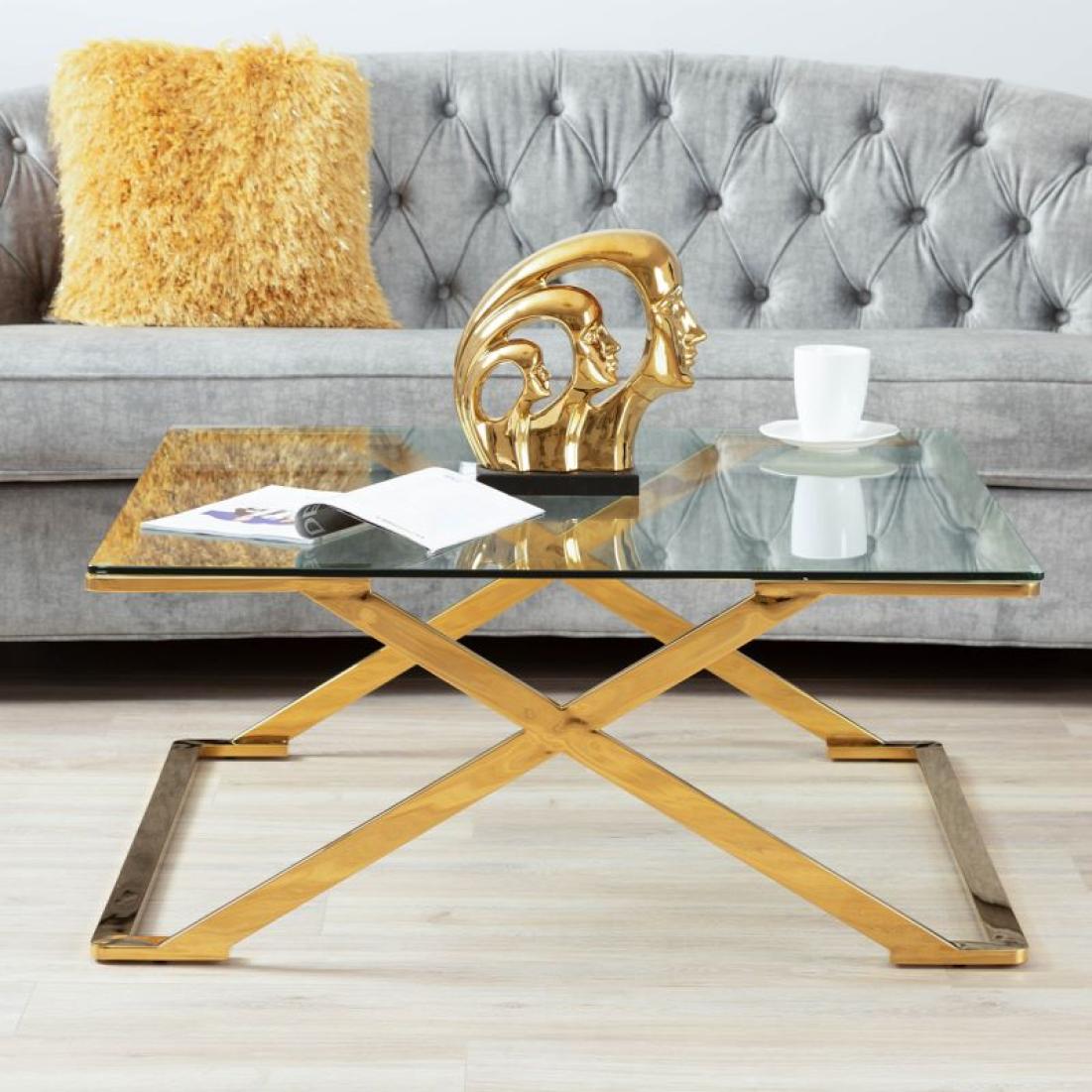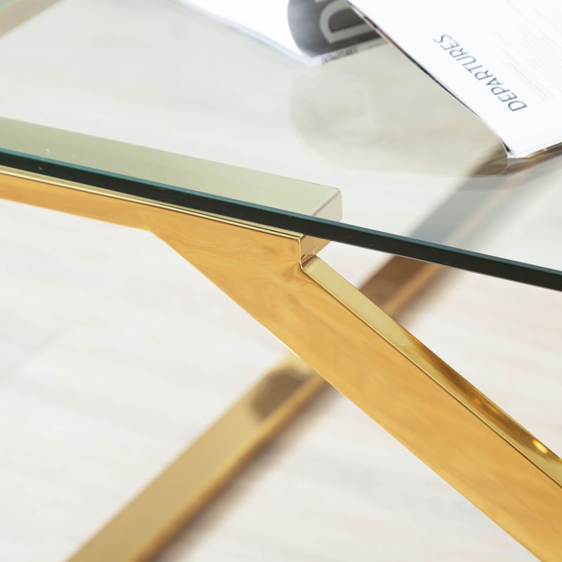 The Axel Gold Metal with Clear Glass Coffee Table, a statement piece that effortlessly blends style and functionality. Crafted with high-quality stainless steel, the gold metal frame exudes elegance and durability. The clear tempered glass top showcases the table's sleek design while providing a spacious surface for drinks, books, and decor.