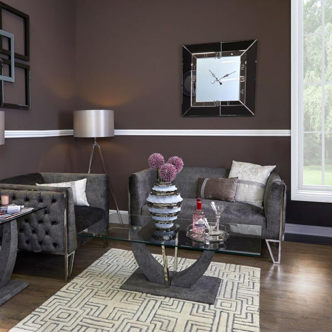 Exude style and sophistication in your living room with this Leo coffee table. Featuring a V shaped faux concrete support with metallic base and a toughened glass table top designed to withstand heavy usage.