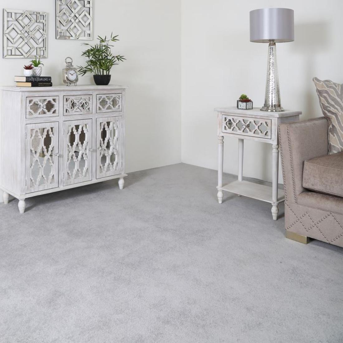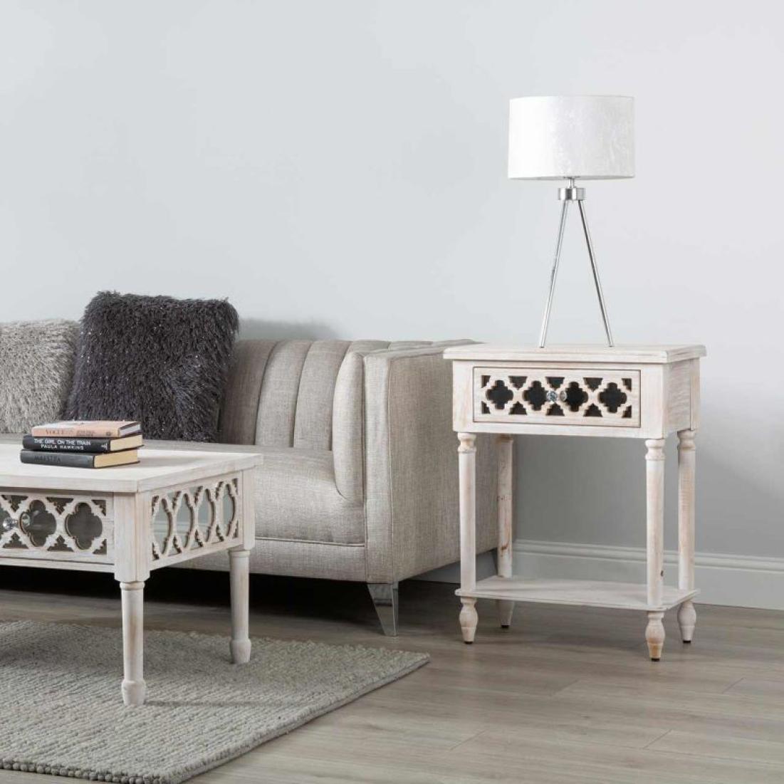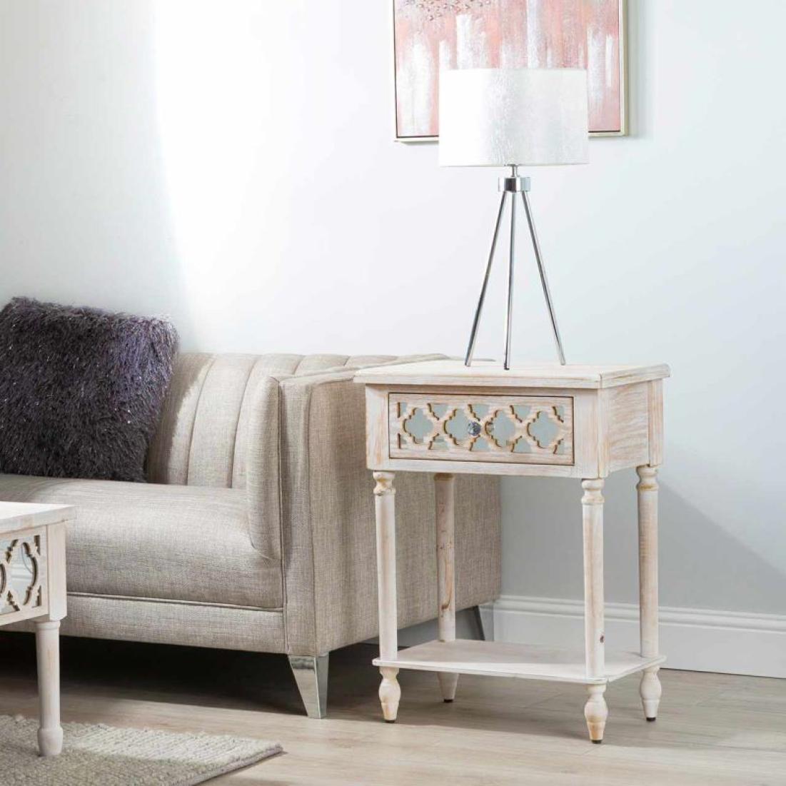 The Hampton Beach Lamp table is inspired by the understated elegance of a New England beach home. Featuring a washed ash effect finish, the spacious drawer is beautifully enhanced by mirror overlayed with intricate fretwork detailing and crystal handles. This versatile piece would be ideal as a bedside, lamp or display table.