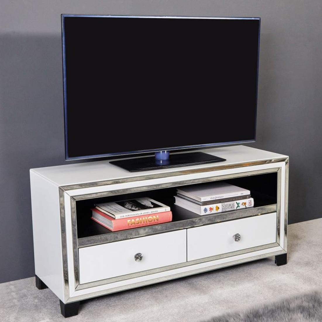The White Manhattan Mirror 2 Drawer TV Entertainment Unit is an excellent TV Entertainment Unit. This beautiful unit is made of wood is durable and stylish. It has plenty of space for your TV equipment books and more. There are two drawers with crystal handles making it easy to keep everything organized. The clear mirror beveled edge gives your room a stylish touch and the white color and black support feet give it a neat and tidy look.