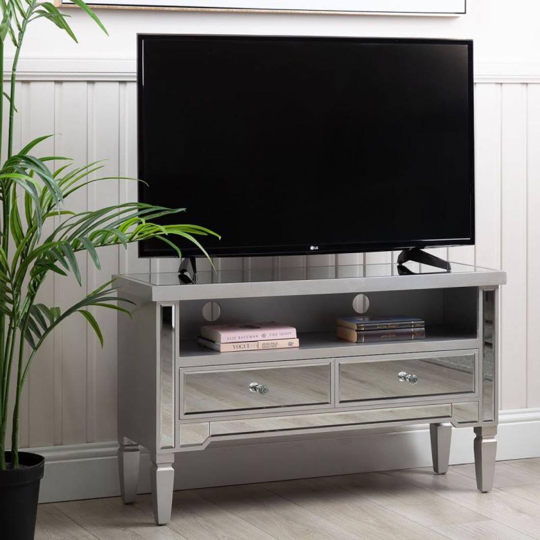 Add class to any living room with this Vista mirror TV entertainment unit with champagne wooden trim. The unit features a mirrored top and tampered wooden legs and two spacious drawers with crystal handles and is a perfect combination of elegance and functionality.