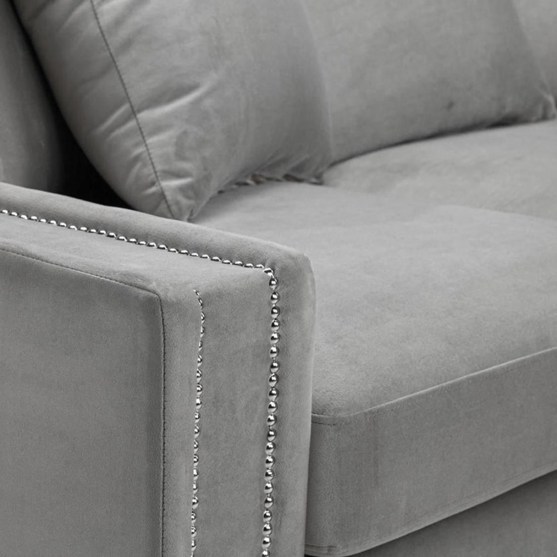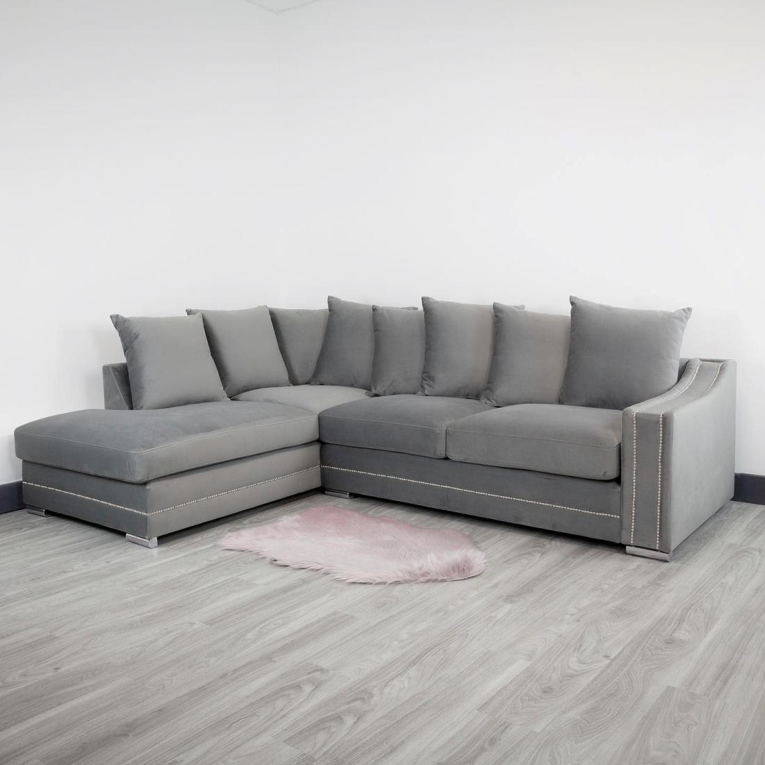 With sloping arms and a decorative stud trim this sofa is all about the details! Our Denver Right Hand Facing Corner Sofa would make a stylish statement in any living room. Upholstered in a beautifully soft Plush Grey fabric that features a trim of metal studs and is completed with strong chrome feet for the ultimate modern look. The plump scatterback cushions make this sofa perfect for snuggling up with your loved ones!